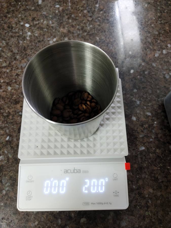 - 저울에 스테인리스 컵을 올리고 원두를 20g에 맞춘다.