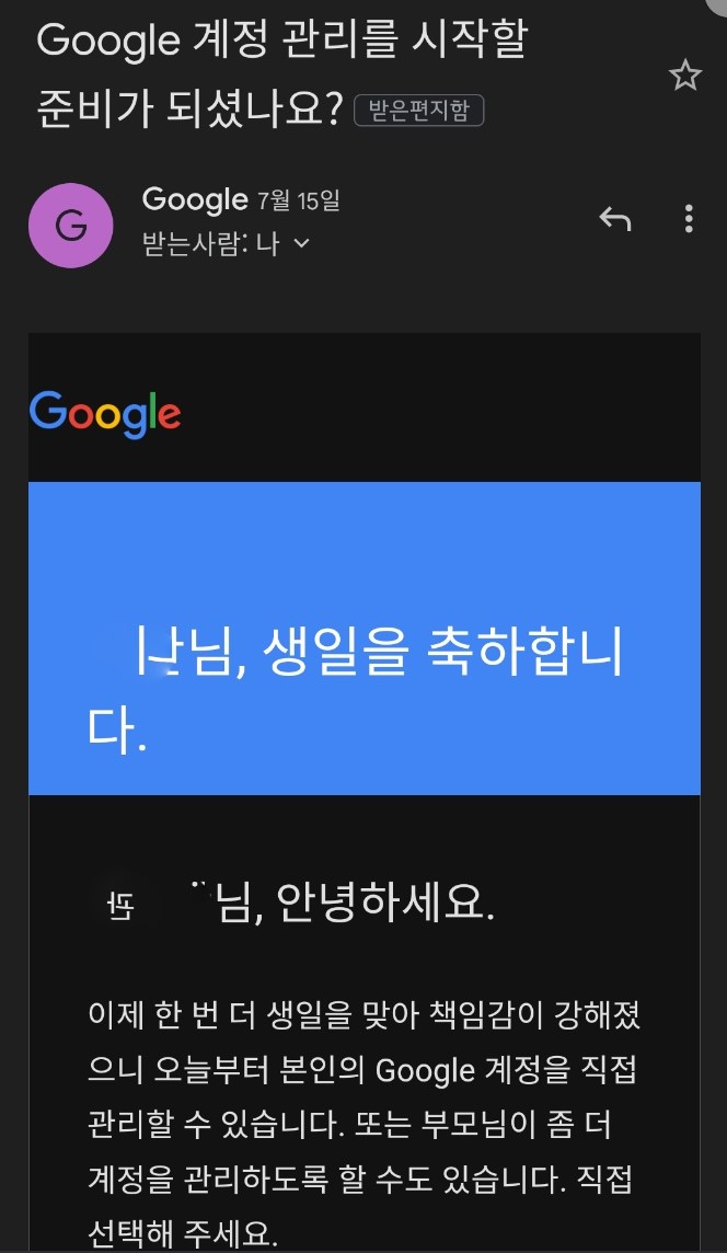 만 14세가 지났을때 구글에서는 지메일(gmail.com)로 계정관리 방법에 대한 이메일을 보냈었다.