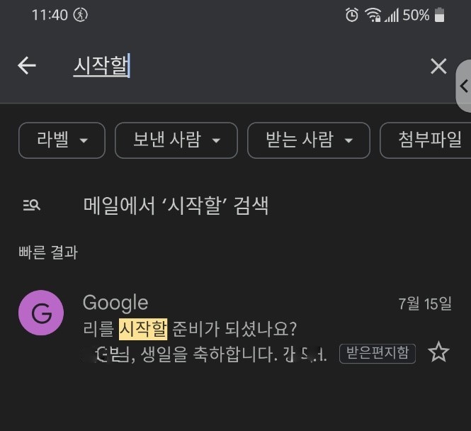 지메일( Gmail )앱을 열고 검색해본다. 나는 "시작할" 이라고 검색했다. 딱 하나가 나온다.