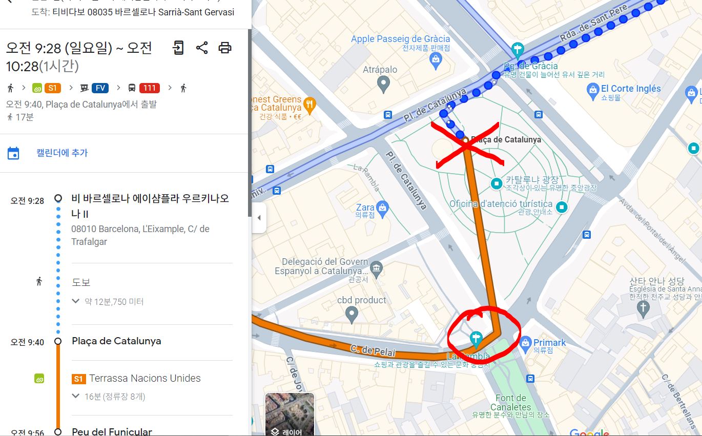 우리는 다시 카탈루냐 광장 위로 올라갔고 길을 건너니(여기) FGC 표시가 보였다. 계단을 내려가 옆을 보니 드디어 S1, S2 이정표가 나왔다.