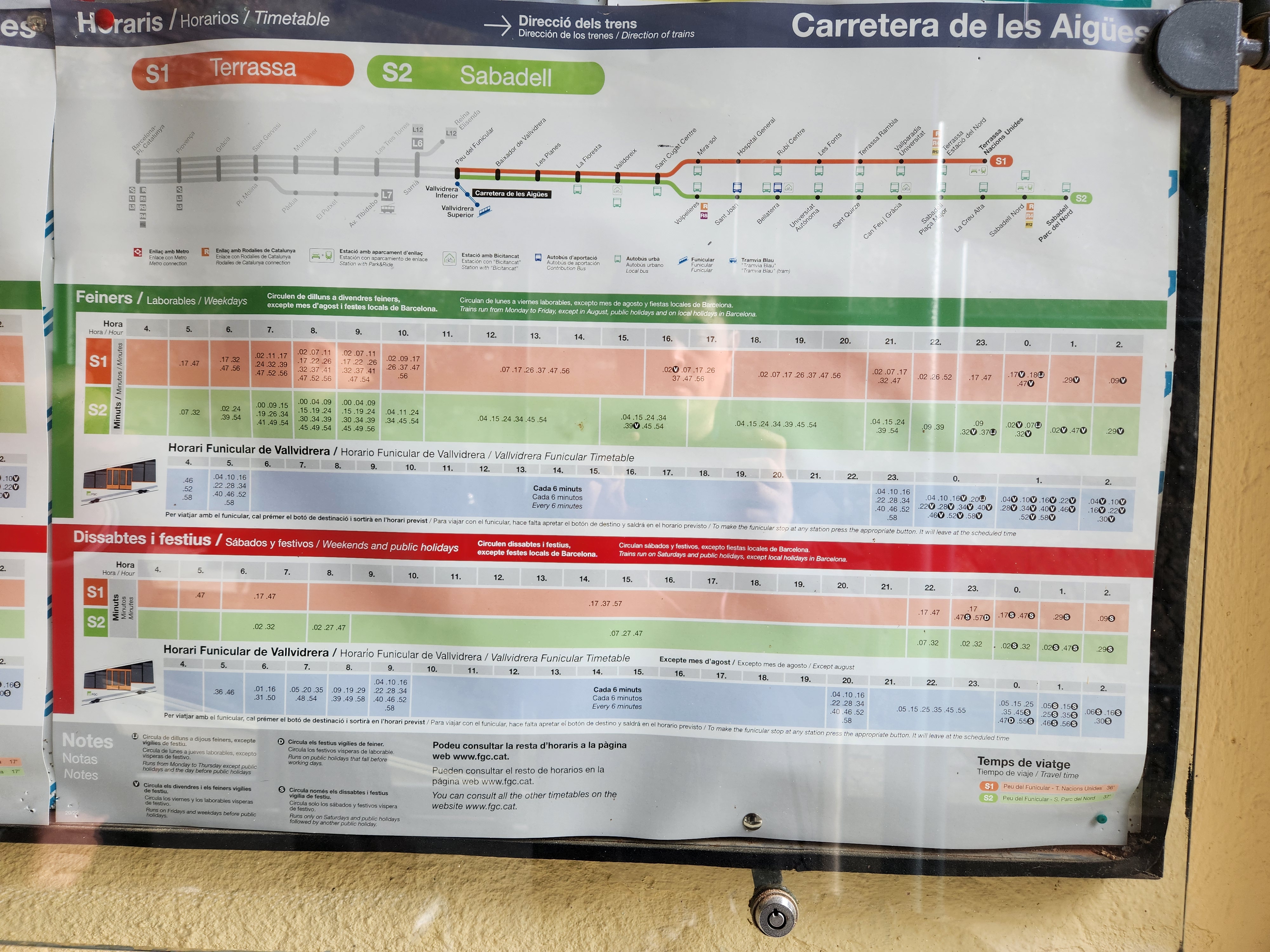 정류장 이름은 Carretera de les Aigues역이고 한 정거장을 더 가야 Vallvidrera Superior 역이었다. 아래의 안내판 사진 참고. 덕분에 평일 낮 시간에는 6분마다 푸니쿨라를 운행한다는 것도 알았다. ^^