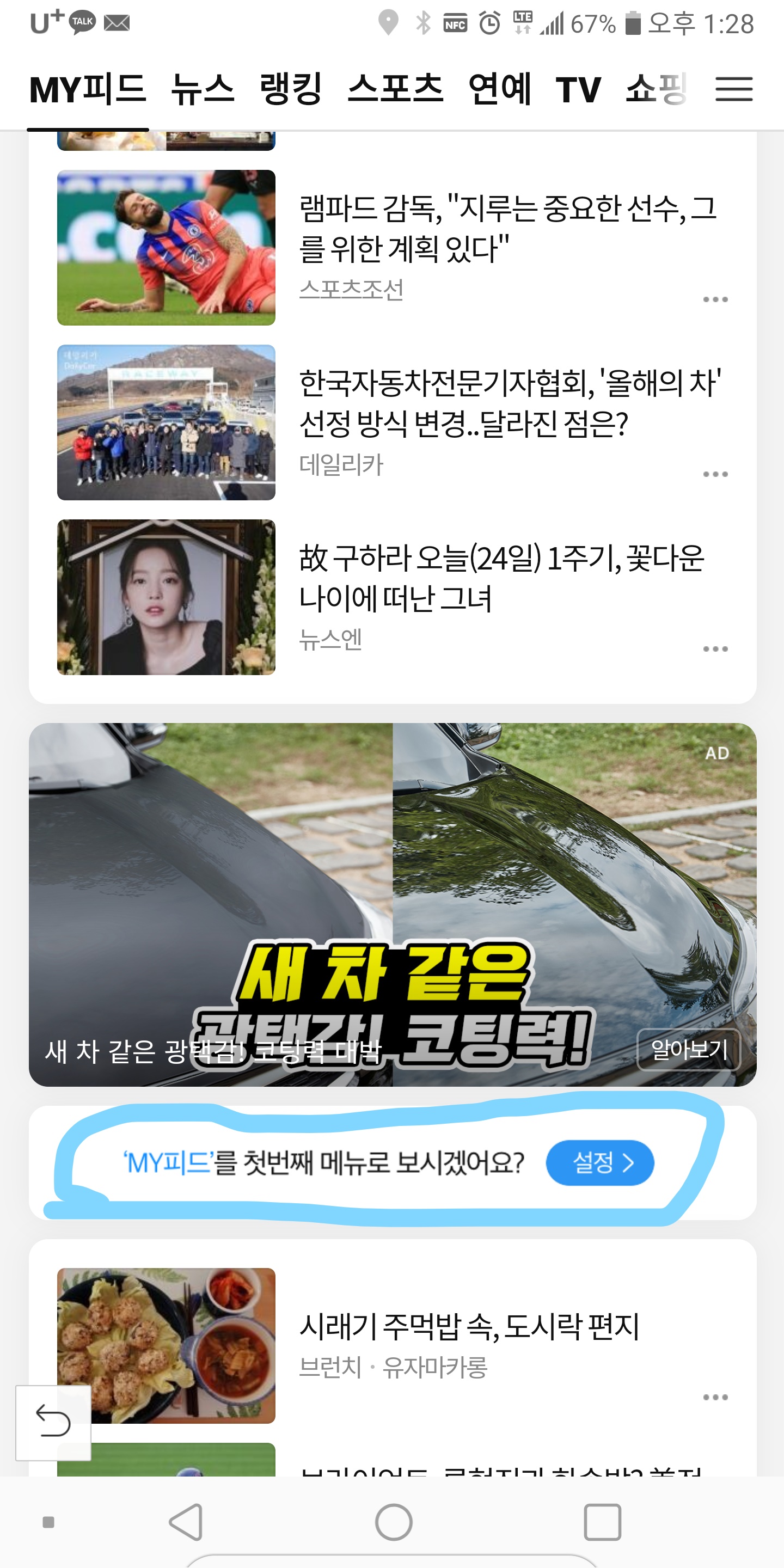 그리고 마지막으로 MY피드를 내려보면 첫번째 메뉴로 설정할 수 있다. 이렇게 하면 다음앱을 실행할때 MY피드가 첫 화면으로 나오게 된다.