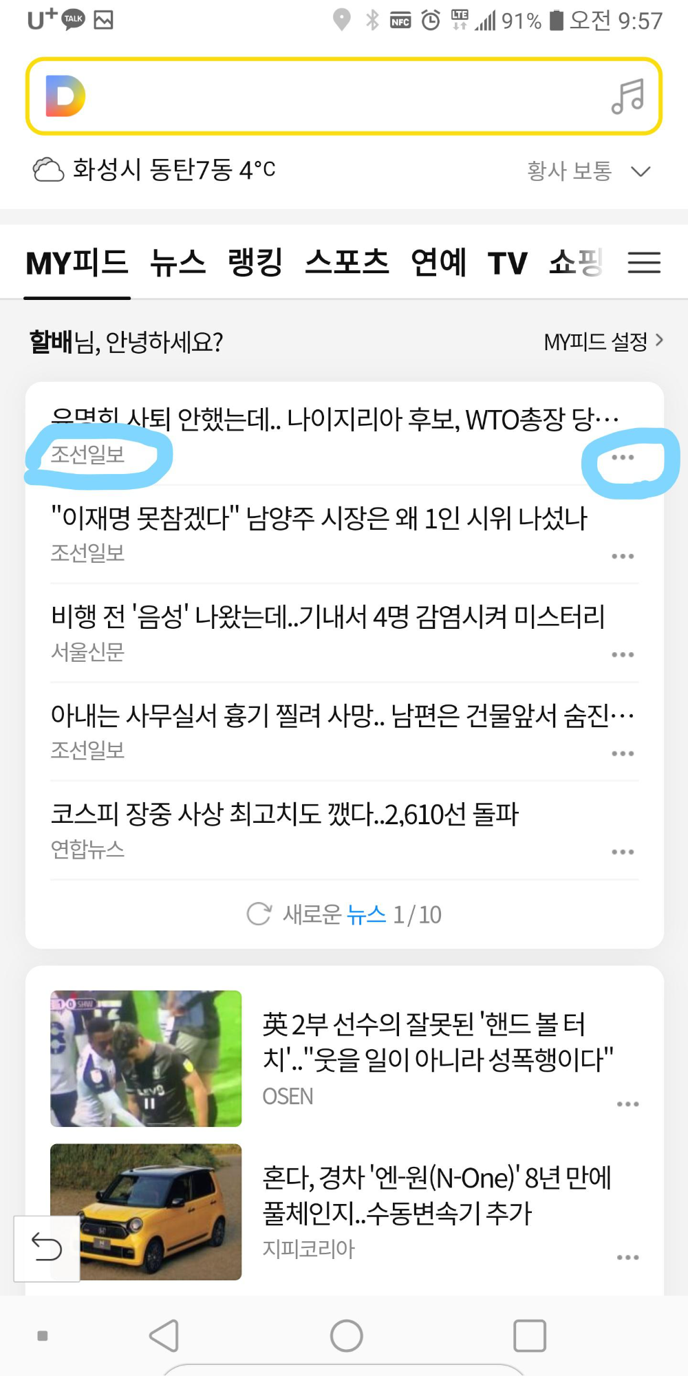 위와 같이 MY피드에는 기사의 헤드라인과 함께 언론사가 나온다. 오른쪽의 점세개 버튼을 누르면 해당 언론사의 구독을 취소 할 수 있다.