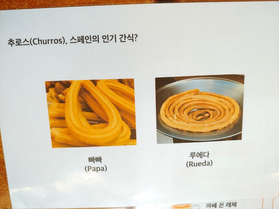 인터넷 상의 어떤 정보를 보니 우리가 먹었던 퉁퉁한 것을 Porras(뽀라스)라고 하고 별 츄러스를 Churros라고 하는 모양이다. (마드리드에서 그렇게 불렀나? 잘 모르겠다)