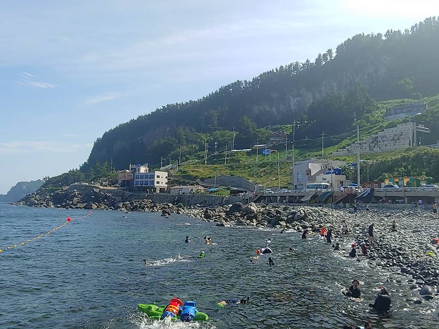 첫날은 저동항에 도착하자마자 근처 숙소에 짐을 풀고 아이들에게 수영복을 입히고 다시 모였다. 스타렉스를 타고 내수전 해수풀장으로 갔다. 이곳은 몽돌해변인데 한쪽에는 아이들용의 해수풀장이 있고 바다에서는 많은 사람들이 스노클링을 하고 있었다. 해수풀장은 성인 허리 정도 되는 깊이다. 아이들은 역시 물에 데려다 놓으면 좋아한다.